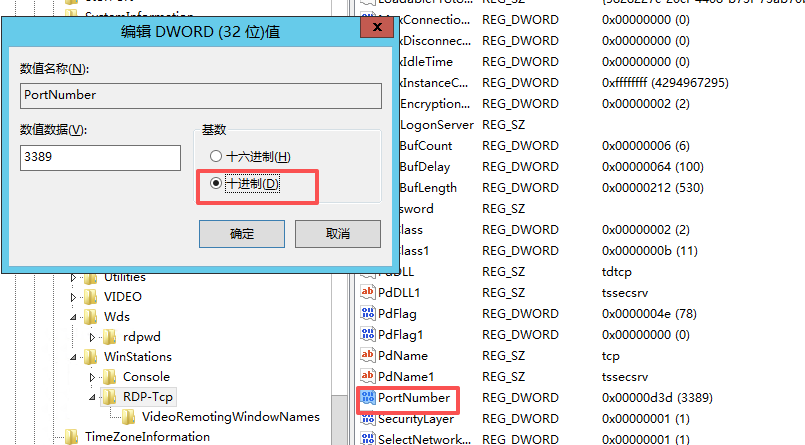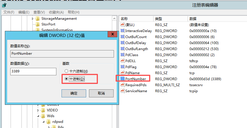 5、找到 PortNumber 项,勾选十进制,修改项值,修改为我们要的端口