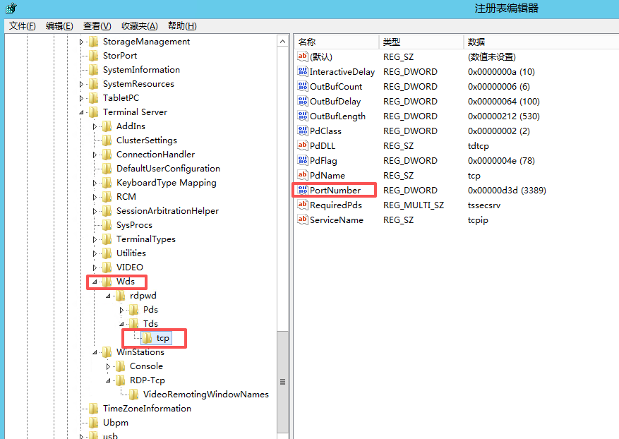 4、找到路径:HKEY_LOCAL_MACHINE\System\CurrentControlSet\Control\Terminal Server\Wds\rdpwd\Tds\tcp,同样的操作,是修改值