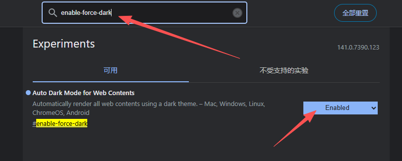 2、在页面左上方的搜索框中输入“enable-force-dark”进行搜索。